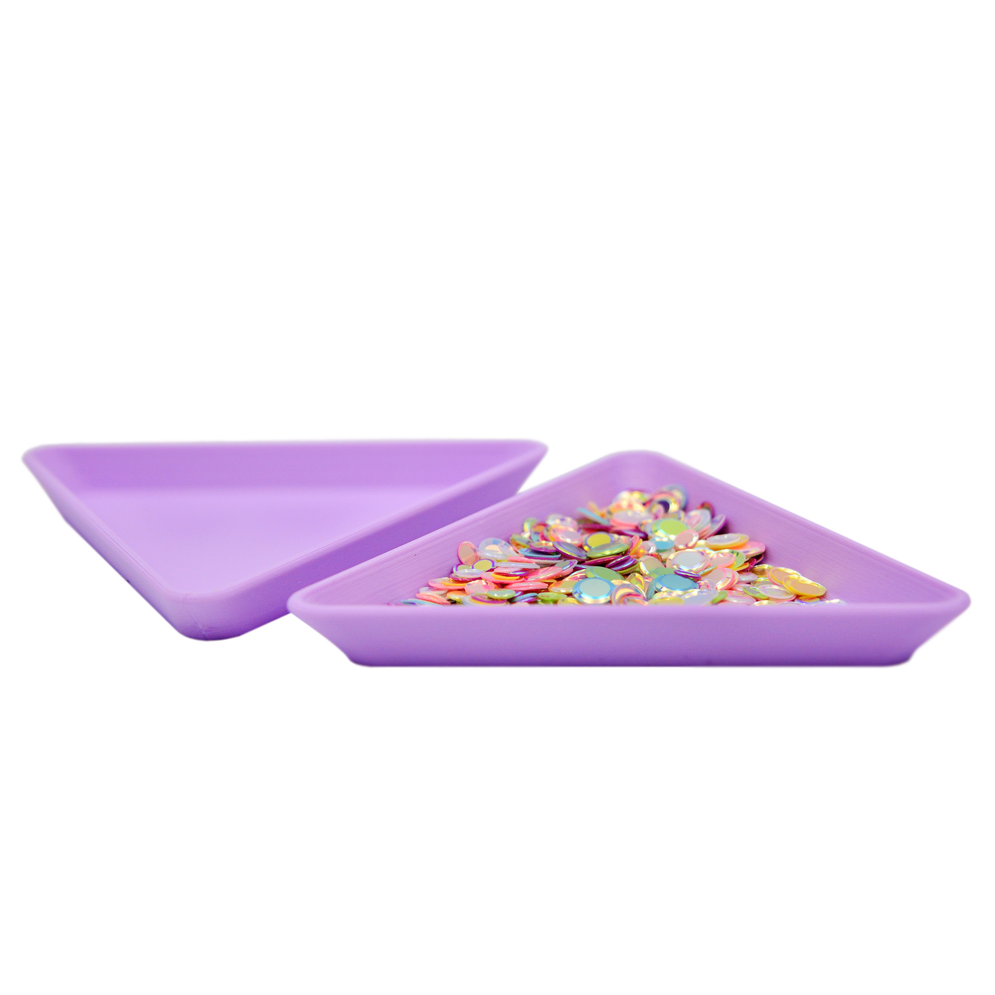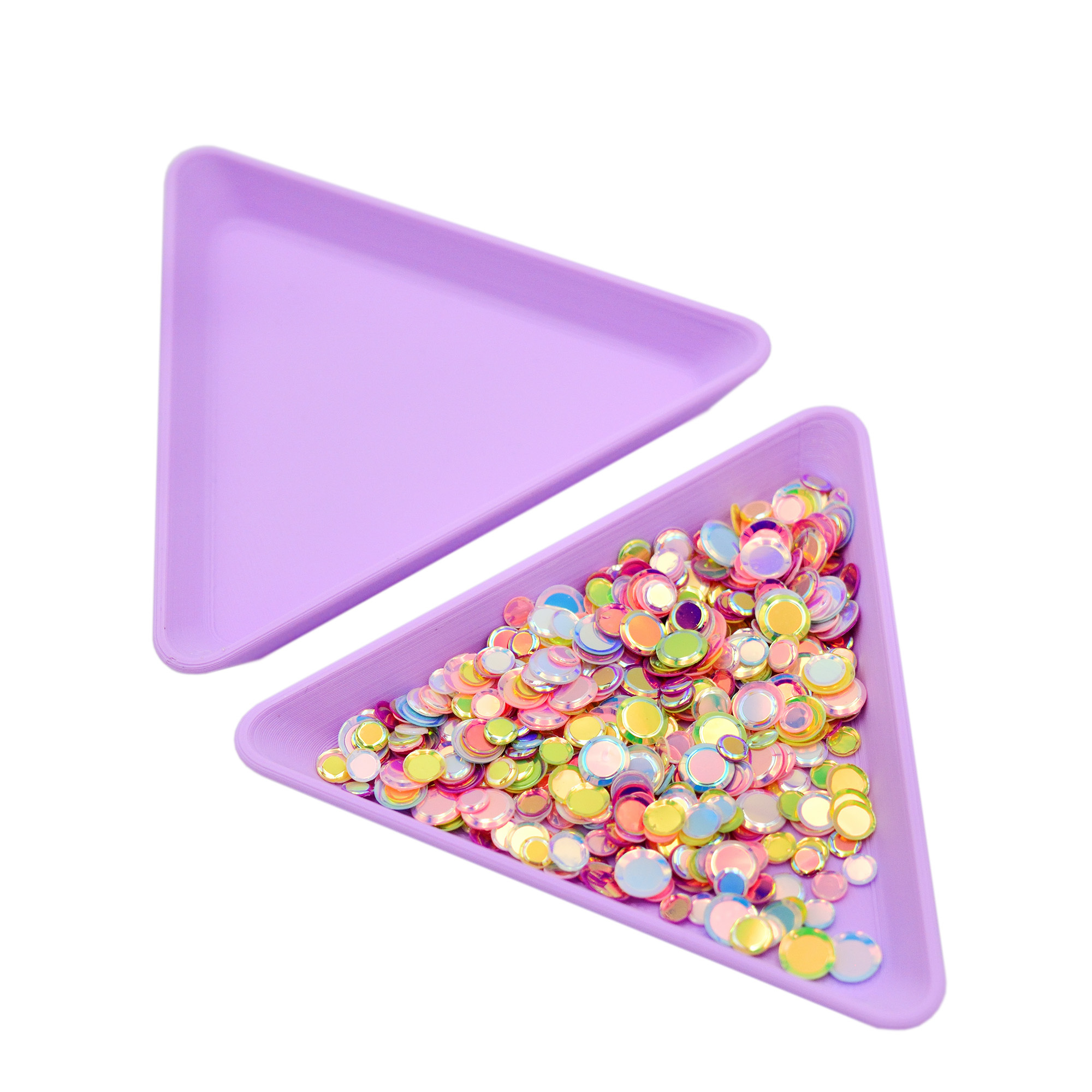 Тарелка является приспособлением для рукоделия и предназначена для мелких сыпучих материалов: пайетки, клеевые полужемчужины, бисер и т.д. Оптимального размера, равнобедренный треугольник с стороной в 7,5 см.